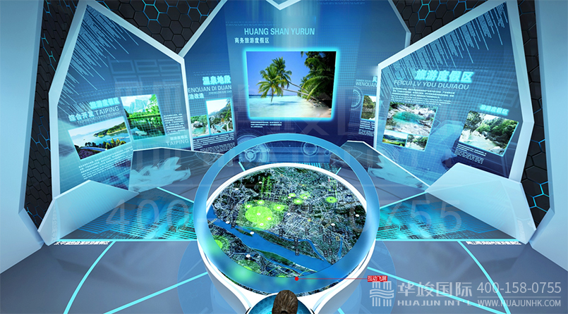 數(shù)字技術(shù): 壁掛沙盤 、 LED查詢觸控屏 、 虛擬講解 、 沉浸式弧幕影院等