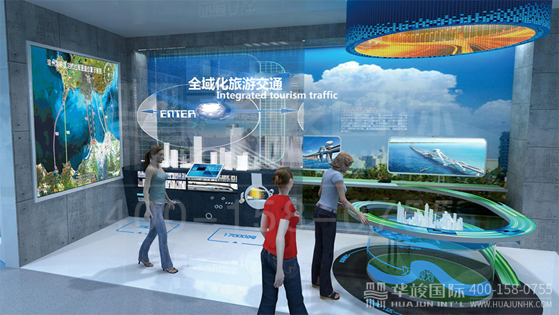 旅游業(yè)——全域旅游交通,以海口當(dāng)前重點(diǎn)規(guī)劃的美蘭機(jī)場(chǎng)、高速公路、跨海大橋等為核心。一方面通過(guò)實(shí)體模型反映城市交通的立體格局,另一方面結(jié)合顯示大屏,全面體現(xiàn)海口交通的便捷,為全域旅游奠定基礎(chǔ)。