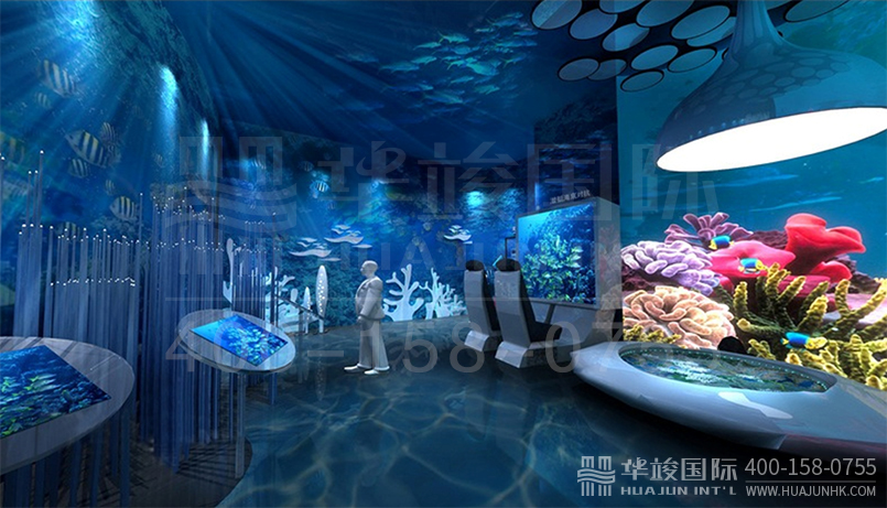 通過(guò)3D投影、多屏觸控、光纖燈等現(xiàn)代科技手法,呈現(xiàn)魚類、珊瑚等豐富多彩的海洋場(chǎng)景。設(shè)置“深海巡游”體驗(yàn)展項(xiàng),參觀者可通過(guò)坐上特制設(shè)備,身臨其境遨游海洋深處。整個(gè)空間相對(duì)封閉,全方位營(yíng)造“海”之意境。